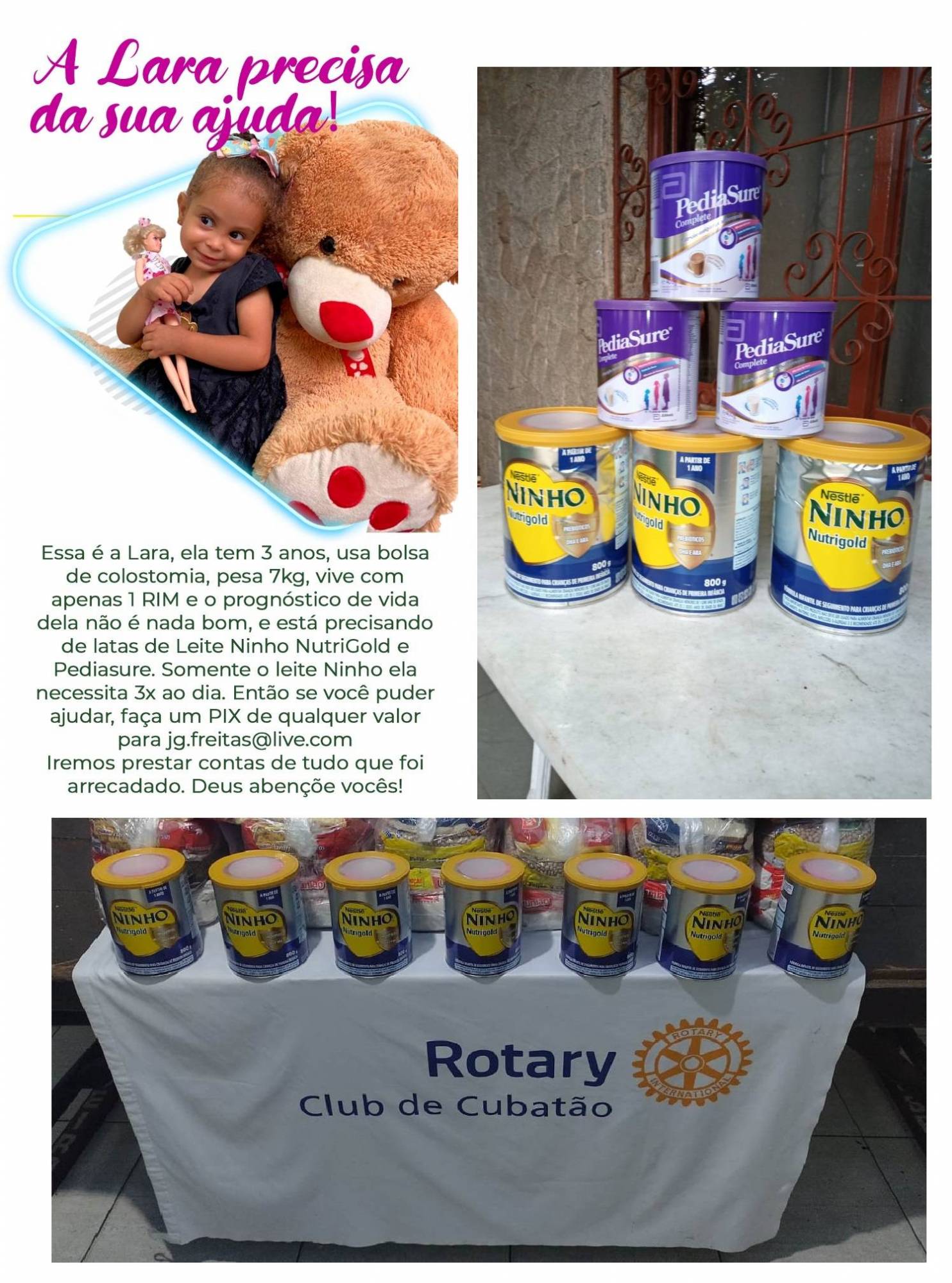 Atendendo a uma solicitação da Casa da Esperança Dr. Leão de Moura de Cubatão de ajuda à menina LARA, o Rotary Club de Cubatão e Rotary Club de S. Vicente Cellula Mater, através de doações de colaboradores, conseguiram arrecadar doações para aquisição de latas de leite e complementos especiais que irão ajudar essa garotinha na sua orientação nutricional.