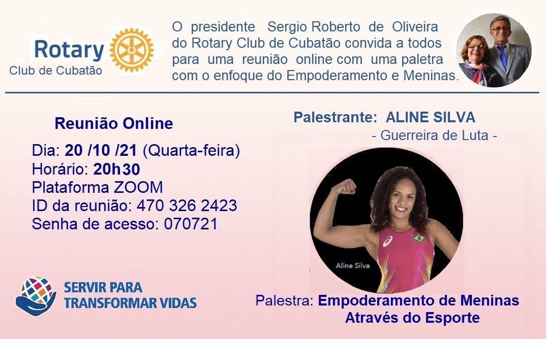 O presidente Sergio Roberto de Oliveira do Rotary Club de Cubatão está convidando você para uma reunião online com uma Palestra com o enfoque do Empoderamento de Meninas.