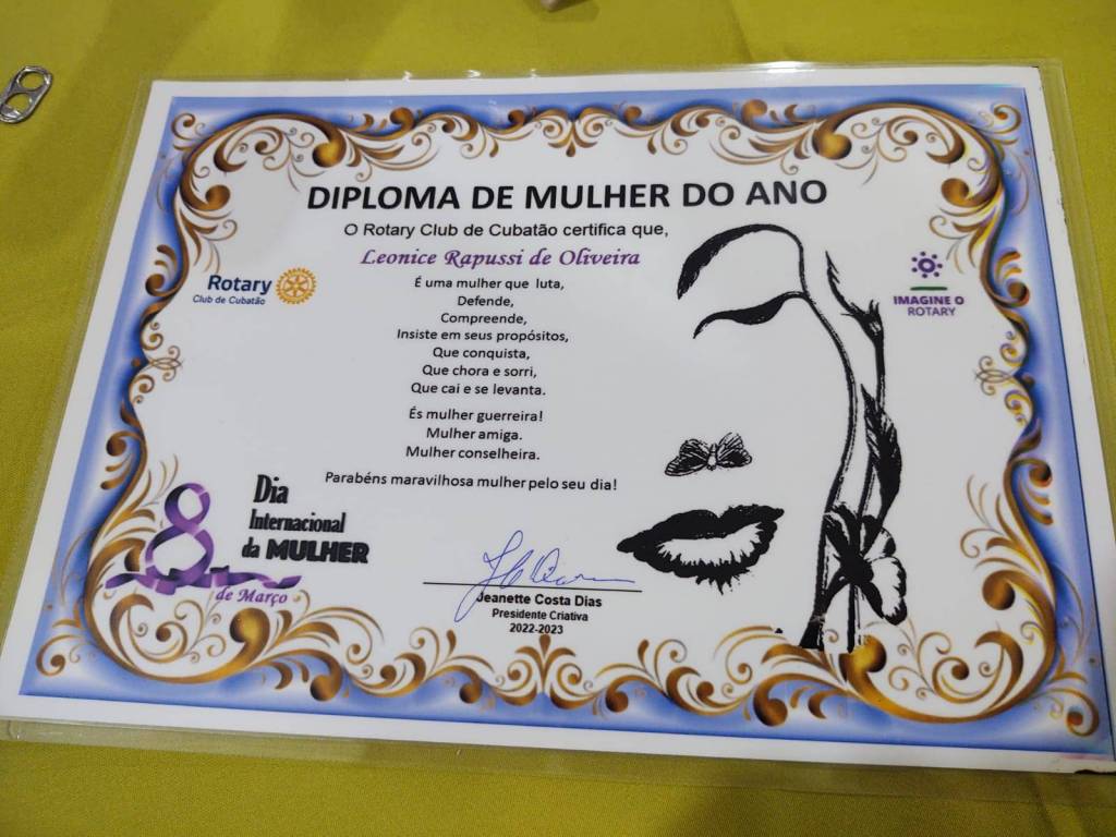 Logo após , ainda em clima de emoção, a presidente Jeanette solicitou a que presidente da Casa da Amizade Leonice Rapussi de Oliveira (Nice) se dirigisse à mesa da presidência onde lhe foi concedido um Certificado em homenagem ao Dia Internacional da Mulher, em agradecimento ao seu empenho e dedicação nas atividades do Clube.
