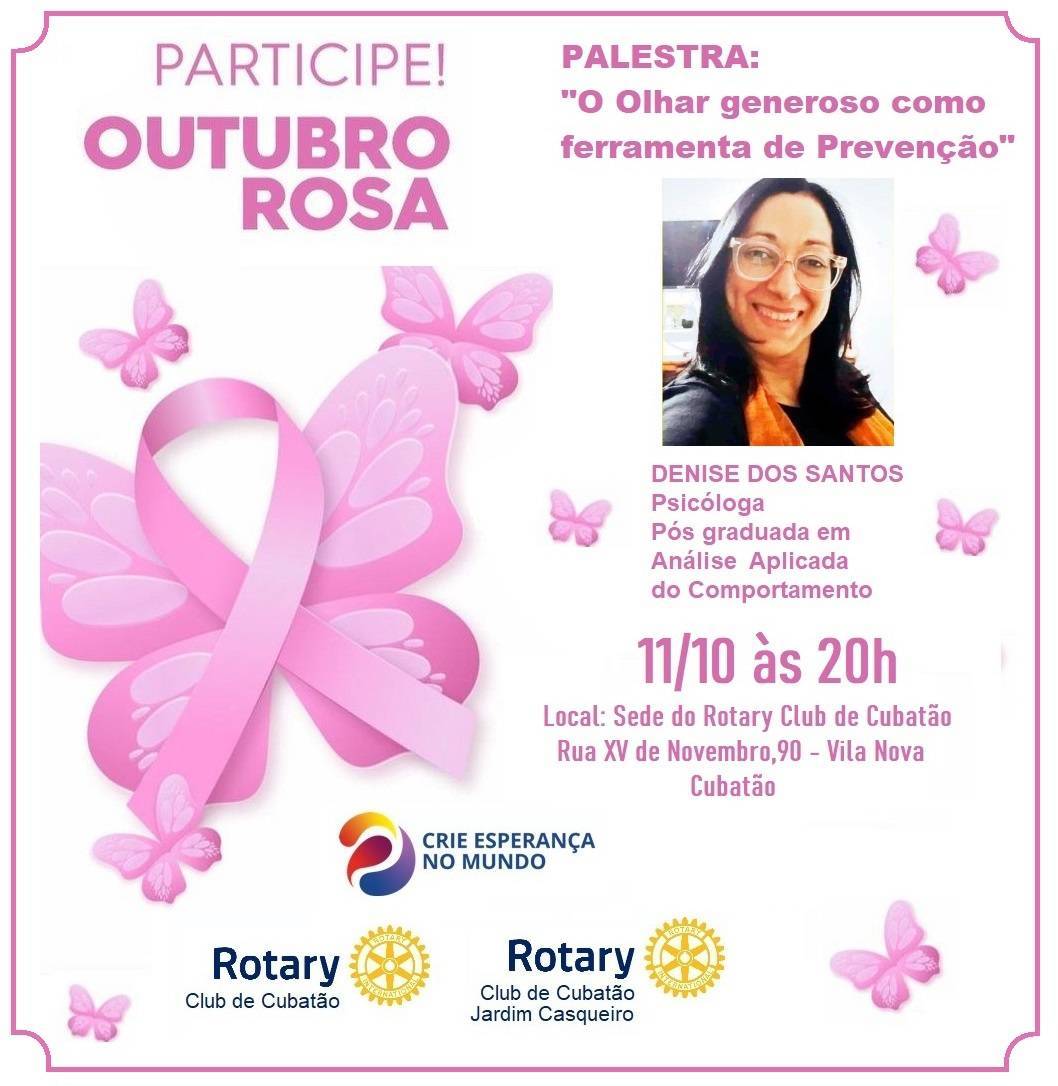 No dia 11/10/23 na sede do Rotary Club de Cubatão sera realizada uma palestra sobreo o Outubro Rosa com o tema:" O olhar generoso como ferramente de Prevenção".