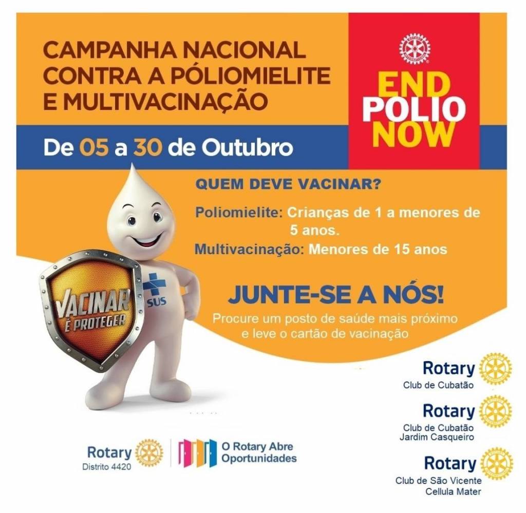 Neste Dia Mundial da Vacinação Conta a Pólio (24/10), em uma Ação conjunta, companheiros do Rotary Club de Cubatão, Rotary Club de Cubatão Jardim Casqueiro e Rotary Club de São Vicente Cellula Mater estiveram reunidos nas proximidades de uma feira livre na cidade de Cubatão com faixa e distribuição de panfletos e orientações com o objetivo de conscientizar ao público que por ali transitava sobre a importância da Vacinação em crianças de 0 a 5 anos de idade contra a Poliomielite e a Multivacinação para menores de 15 anos. Todas as abordagens foram feitas com muito cuidado e proteção e disponibilizando álcool em gel em nossa tenda montada para essa ação.